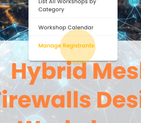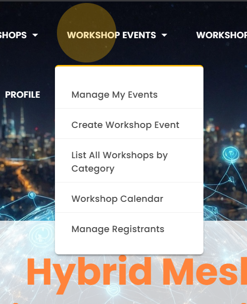 - Move your cursor over the menu item for Workshop Events. This will show more sub-menu items.