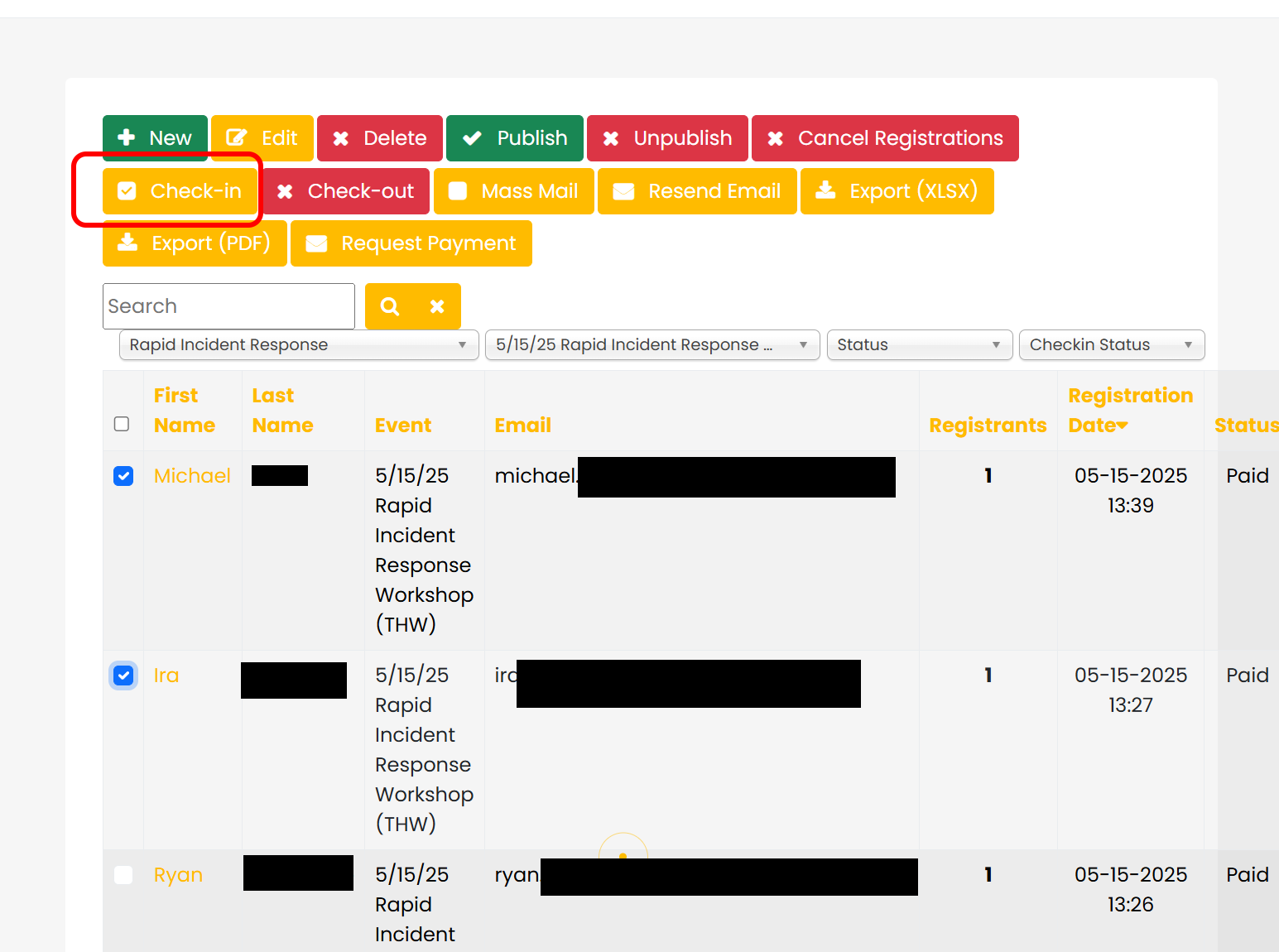 - Click the Red Circle under the column Checked In, this will time date stamp when you click it.